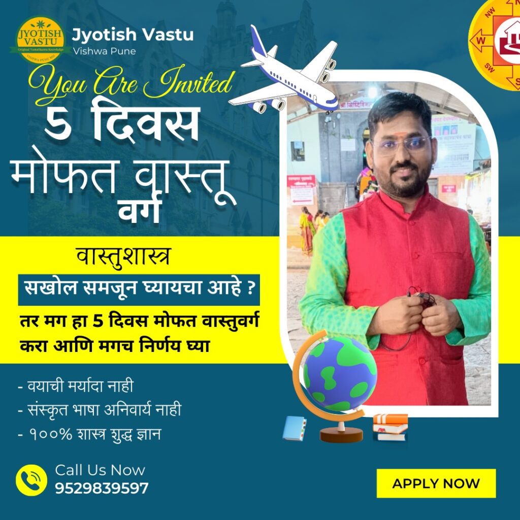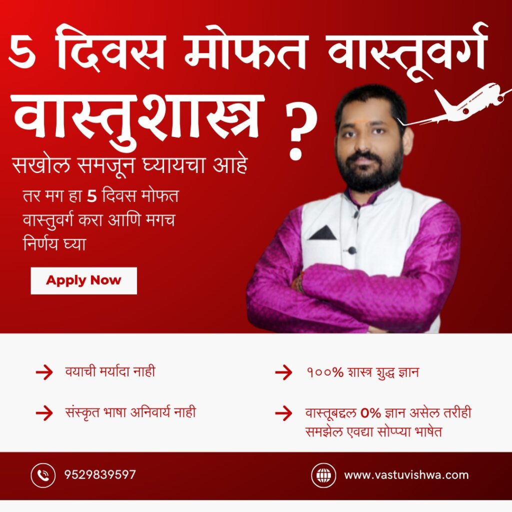 Launching New Batch Of Free VastuShastra Class | ५ दिवसीय मोफत वास्तुशास्त्र वर्ग | Regestration Process ज्योतिष वास्तु विश्व संशोधन केंद्र पुणे आयोजित ५ दिवसीय मोफत वास्तुशास्त्र वर्ग Regester करण्यासाठी खालील लिंक वरती क्लिक करा आणि आमच्या Official WhatsApp Group मध्ये Join 👇 https://guruji.vastuvishwa.com/freewebinarb16/ नमस्कार,🙏 मी उमेश कुलकर्णी , ज्योतिष वास्तू विश्व संशोधन केंद्र पुणे या संस्थेचा संस्थापक. मी निघालो आहे एका Mission वर, मदत करू इच्छितो कमीत कमी १ लाख मराठी लोकांची, कि त्यांनी Vastu चे ज्ञान माझ्याकडून मिळवावे त्याला इम्प्लिमेंट करावे आणि त्यातून पैसे कमवून सुखी समाधानी आनंदी आयुष्य प्रदान करावे . या Mission ला यशस्वी करण्यासाठी मला हवी आहे तुम्हा सर्वांची साथ. गेल्या 15 वर्षांपासून मी या क्षेत्रात काम करीत आहे. अनेक मोठ्या Clients सोबत मी काम केले आहे. पुणे येथे माझे स्वतःचे Office आहे, बऱ्याच संस्थेमध्ये मी वास्तुशास्त्र हे विषय शिकवले आहेत . वास्तुशास्त्र हे खूप विस्तारित क्षेत्र आहे. वास्तुशास्त्राविषयी मोबाईल आणि इंटरनेट ची उपलब्धता यामुळे जास्ती जनजागृती झालेली आहे . आजकाल Property च्या किमती करोडो च्या घरात गेलेल्या आहेत. अशावेळी घर खरेदी करताना आपले घर वास्तुप्रमाणे आहे की नाही हे पाहण्याकडे सगळ्यांचा कल आहे. त्यामुळेच आजकाल वास्तू कन्सल्टंट ला जास्त डिमांड आलेले आहे. आम्ही दिलेला सल्ला लोकांना आवडला आणि त्यांनी हे शिकण्याची तयारी दाखवली म्हणून आम्ही वास्तुशास्त्राचे क्लास सुरू केले, प्रत्येकाला एक्सपर्ट व्हायचे आहे म्हणून आपण आपल्या कम्युनिटी चे नाव ठेवले ज्योतिष वास्तू विश्व. यामध्ये चांगले Vastu Expert तयार करणे हा माझा प्रामाणिक प्रयत्न आहे, सर्वसामान्य माणसाला Vastushastra शिकवण्याचा, प्रत्येक मराठी बांधवांपर्यंत Vastu चे ज्ञान, शास्त्राचे ज्ञान देऊन सुखी समृद्धी आयुष्य प्रदान करणे हे माझे ध्येय आहे . वास्तू-शास्त्राच्या ज्ञानाने आपल्या Business ला तसेच वैयक्तिक प्रगतीमध्ये अनेक पटींनी वृद्धी करा , आजच वास्तू वर्गाला Register करून जॉईन करा आणि सुख, समृद्धी आणि आनंदाचे दरवाचे खुले करा. खाली दिलेली लिंक जास्तीत जास्त बंधू भगिनी, नातेवाईक, मित्र-मैत्रिणींना शेअर करा आणि आलेल्या संधीचा लाभ घ्या.👇 https://guruji.vastuvishwa.com/freewebinarb16/ ज्योतिष वास्तू विश्व संशोधन केंद्र पुणे संपर्क – 9527355288/ 9529839597.